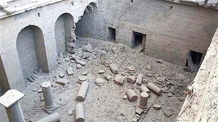 The citadel of Bosra (Buṣrā aš-Šām), an important Islamic stronghold in the Hauran south of Damascus, was hit by barrel bombs during an attack on the UNESCO World Heritage Site of Bosra. The local community of Bosra had already reported minor damages in July this year. From the eleventh century onwards different Islamic rulers turned the 2nd-century Roman theater of the town into a mighty bulwark. Its strategic value became once more important when it was used by the Syrian army as a military base in the past years, which was lost to the Syrian rebels together with the town in March 2015. The reported damages comprise the collapse of walls of the citadel’s western tower, the crumbling of the pillars and a jamb of the south-western door of the nearby western portico, and destructions at the castle’s wastewater disposal system. Additionally, the second level of the passageway surrounding the theater was breached, blocking subjacent corridors with fallen stones.